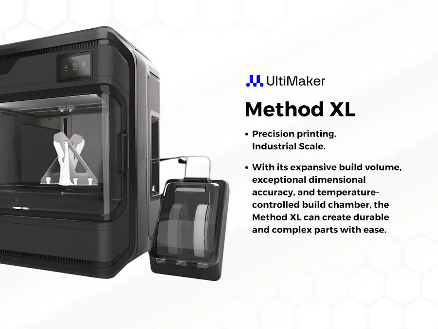 The UltiMaker Method XL combines industrial-grade capabilities with user-friendly features, making it the perfect solution for large, production-quality 3D printing.